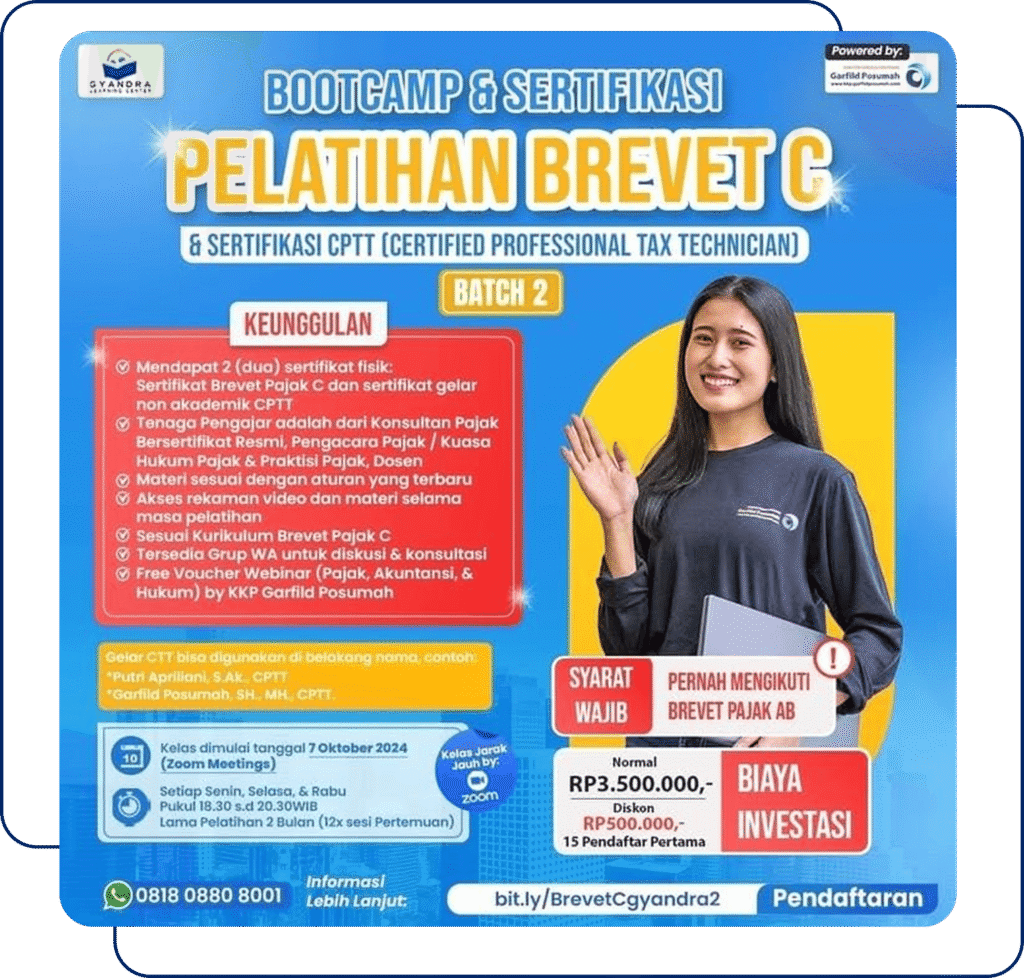 Dapatkan wawasan mendalam tentang PPh, PPN, PBB, dan berbagai aspek perpajakan lainnya, langsung dari para ahli. Jadilah yang terbaik dalam bidang pajak dan buktikan keahlian Anda! Kami siap membantu meraih kesuksesan!